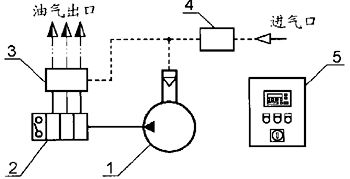 图8是油气润滑系统示意图。根据被润滑设备的润滑点的型式和数量确定润滑系统每小时的总耗油量和工作制度。接通电源,经压缩空气处理装置(4)处理过的压缩空气分两路,一路控制气动泵(1),另一路进入油气混合块(3)。气动泵按事先设定的工作程序进行工作,把润滑油供送到递进式分配器(2),润滑油经递进式分配器精确计量和分配后被输送到与气源相连接的油气混合块,并在油气混合块中与压缩空气混合形成油气流从油气出口输出进入油气分配器,经油气分配器分配后以多股极其精细的均匀的连续油气流喷射到润滑点。整个油气润滑系统的工作由PLC控制装置(5)控制。