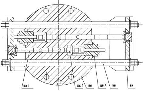 泵体内二组活塞,每组活塞由1个工作塞和2个控制活塞组成,当一组活塞中的工作活塞完成吸油过程时,另一组活塞中的工作活塞则把润滑脂压向出油口。如下图所示,当滑叉向左运动时,上组活塞完成吸油,下组活塞完成压油,开始新的工作循环。这时下组活塞1、2向左运动,活塞2在弹簧力作用下到达极限位置关闭出口,而活塞1继续向左运动,这时活塞2和1之间形成真空,其真空度随活塞1的左移不断增大,滑叉运动到极限位置活塞1打开吸油口,润滑脂从吸油口吸入,如弹簧力不足,没将活塞2推到极限位置,此时推杆3会在滑叉的推动下强制地把活塞2压到极限位置,同时上组活塞1、2、3向左运动,活塞1先关闭吸油口,被吸入的润滑脂在活塞1的推动下向左移动,当活塞2把出油口打开时,活塞2和推杆3 的运动也就停止,活塞1继续左移,把润滑脂从出油口压出,活塞1、2接触滑叉也已运动到极限位置完成半个循环的工作,如此周而复始地循环,二组活塞交替地将润滑油脂从出油口压送出来,压出的润滑脂经泵装置连接法兰上的过滤器过滤后向系统供送。