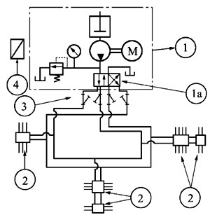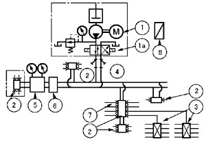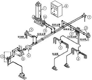 液压换向阀 1a 具有切换两条供油主管和控制供油主管末端的压力的功能,当供油的主管的末端压力达到液压换向阀的设定压力,液压换向阀换向,并向电控柜发送信号,润滑泵①停止,系统再次工作,从另一条主油管供油。