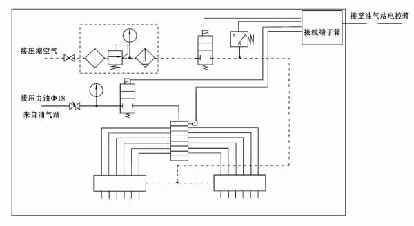 2、油气卫星站的进气接口必须与工厂压缩空气(允许使用氮气)供气管线相连,决不允许使用其它介质的气体,以免发生安全事故。
