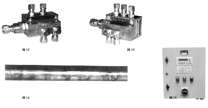图11是油气流从油气分配器入口入喷射的示意图;图12为具有4个油气出口的AJSV型Jetsplit油气分配器,这种油气分配器用于第一级油气分配;图13为具有5个油气出口的JSV型Jetsplit油气分配器,这种油气分配器用于第二级油气分配,把油气流供送至多个润滑点。