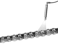 链条的种类很多,有滚子链、板式链、悬挂链、齿形链以及各种异形链等。针对不同种类的链条,有不同的润滑方 式,可采用泵和分配器组成的润滑系统用油刷对链条进行涂油润滑(见图18),也可用脉冲泵对链销进行润滑(见图19);另一种润滑方式,即利用油气润滑的原理对链条进行极其精细的喷射润滑(见图20),一台油气润滑站可同时对输送辊道上的几十根链条进行润滑,这种润滑方式尤其适用于传动速度较快的滚子链。